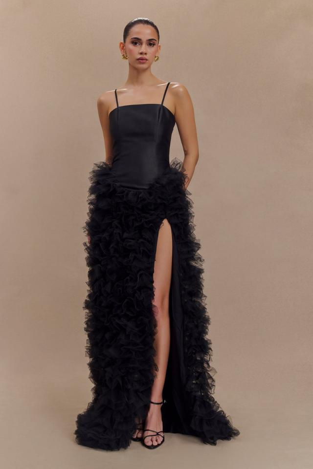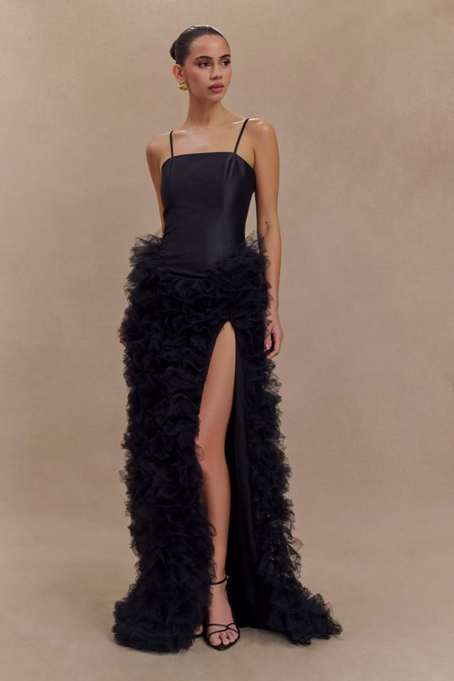 Princess behaviour. The MAGNOLIA Tiered Ruffle Maxi Dress is a captivating blend of elegance and charm. Featuring a straight neckline and adjustable straps, this dress ensures a perfect fit. The fitted bodice and round waistline accentuate your figure, while the full chiffon ruffle skirt adds a touch of whimsy. With its maxi length and front leg split, the Magnolia dress is perfect for making a graceful statement at any special occasion.