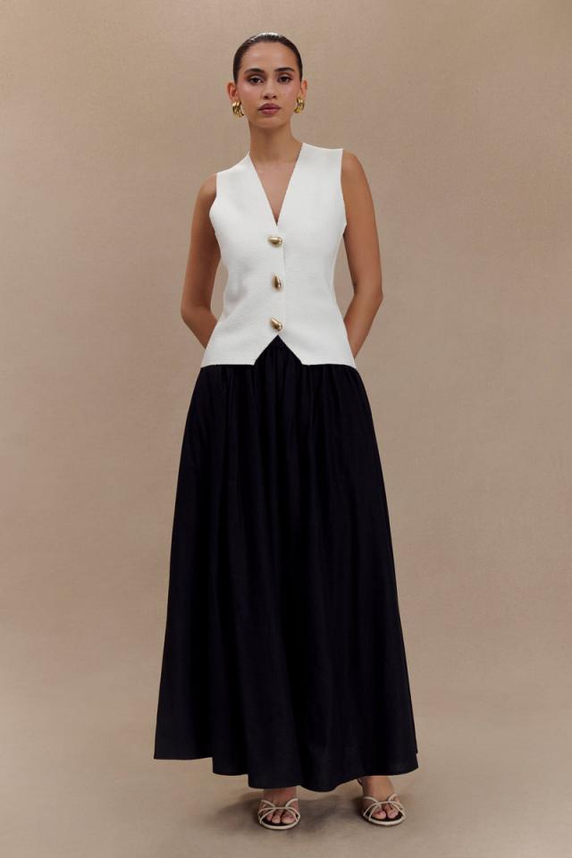 Chic and sleek. Elevate your layering game with the MALIKA Sleeveless Gold Button Vest. This stylish piece features a flattering V front neckline and a button front closure adorned with eye-catching gold decorative buttons, adding a touch of luxury to your look. The sleeveless design makes it perfect for warm weather or as a chic layering option in cooler months. Crafted from soft knit fabrication, the vest offers a comfortable fit while remaining unlined for a lightweight feel. Pair it effortlessly with the Malika Knit Tailored Shorts for a coordinated and polished ensemble.
