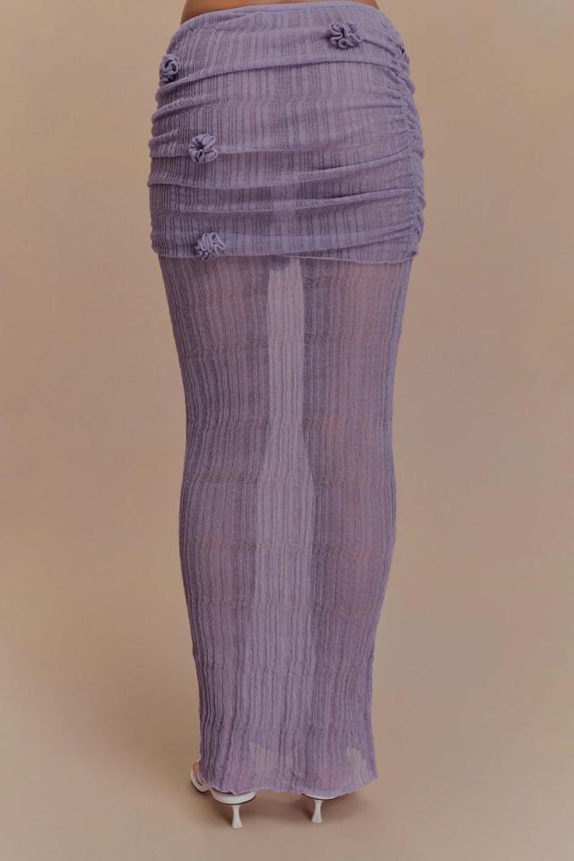 Turn heads with effortless elegance. The ORIANNA Orchid Knit Maxi Skirt is a statement piece designed to captivate. Featuring a mid-rise fit and a fishtail hem shape, this skirt flows beautifully with every step. A gathered waist overlay with a delicate flower detail adds a touch of feminine charm, while the sheer knit fabrication brings an alluring edge. Unlined for a lightweight feel, this skirt is perfect for making an impression at any occasion. Pair it with the Orianna Orchid Long Sleeve Knit Top for a chic, head-turning ensemble.